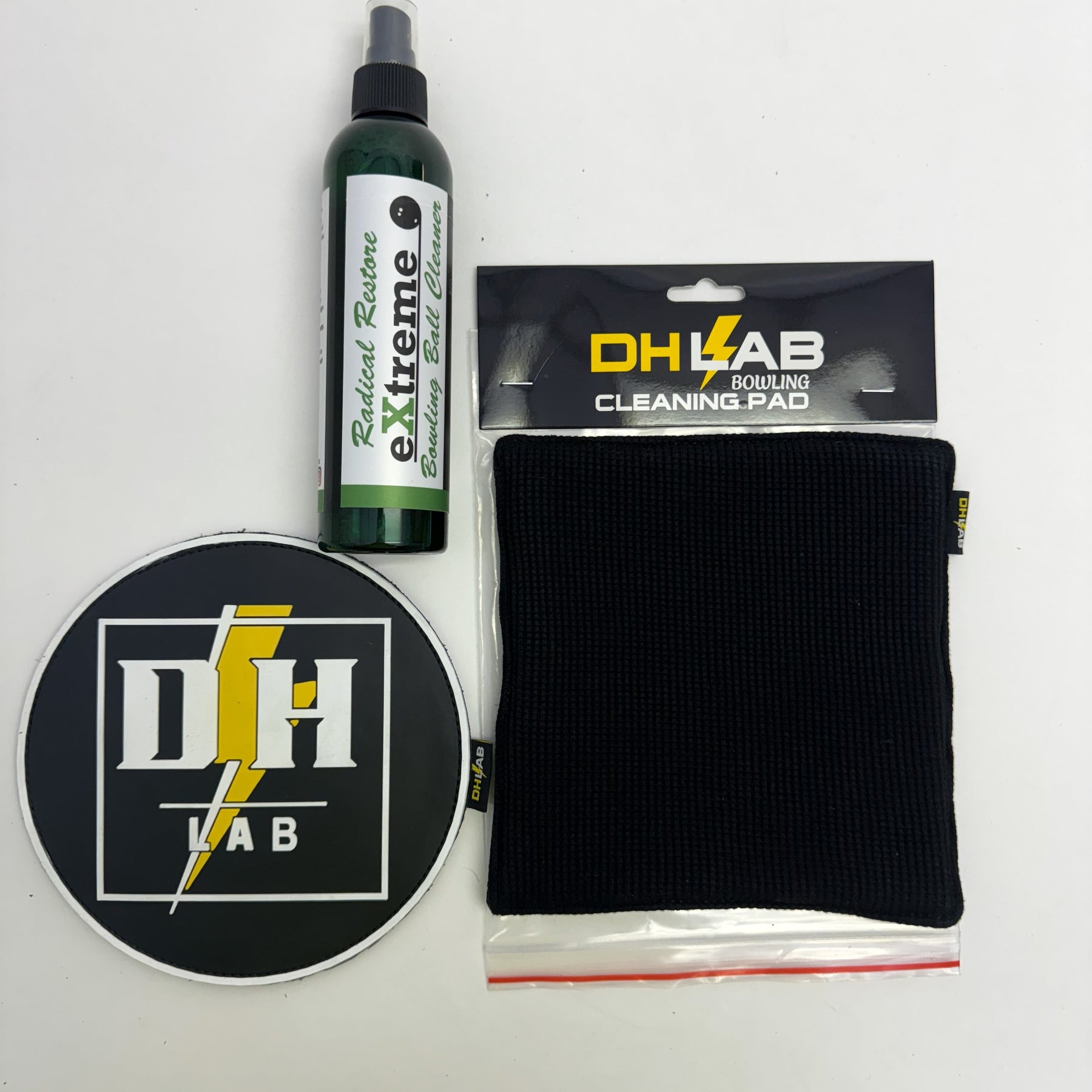 Everything you need to clean, maintain, and eliminate oil from your bowling ball. This bundle pairs Radical Restore Extreme Cleaner with a premium rubber-backed DH Lab Shammy and our brand-new microfiber cleaning pad for a full, start-to-finish ball care routine.