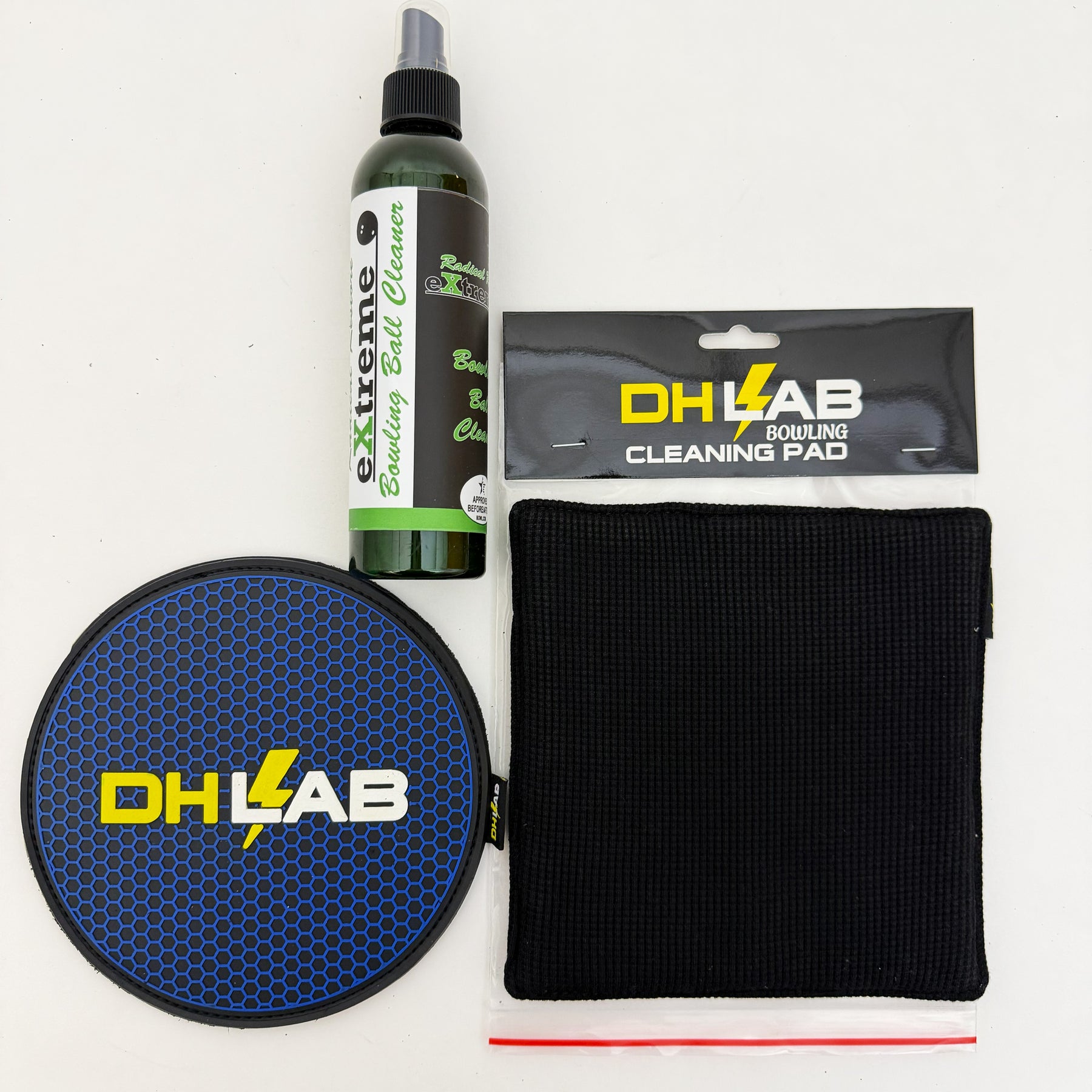 Everything you need to clean, maintain, and eliminate oil from your bowling ball. This bundle pairs Radical Restore Extreme Cleaner with a Premium Rubber Backed DH Lab Shammy and our brand-new Textured Microfiber Cleaning Pad for a full, start-to-finish ball care routine.